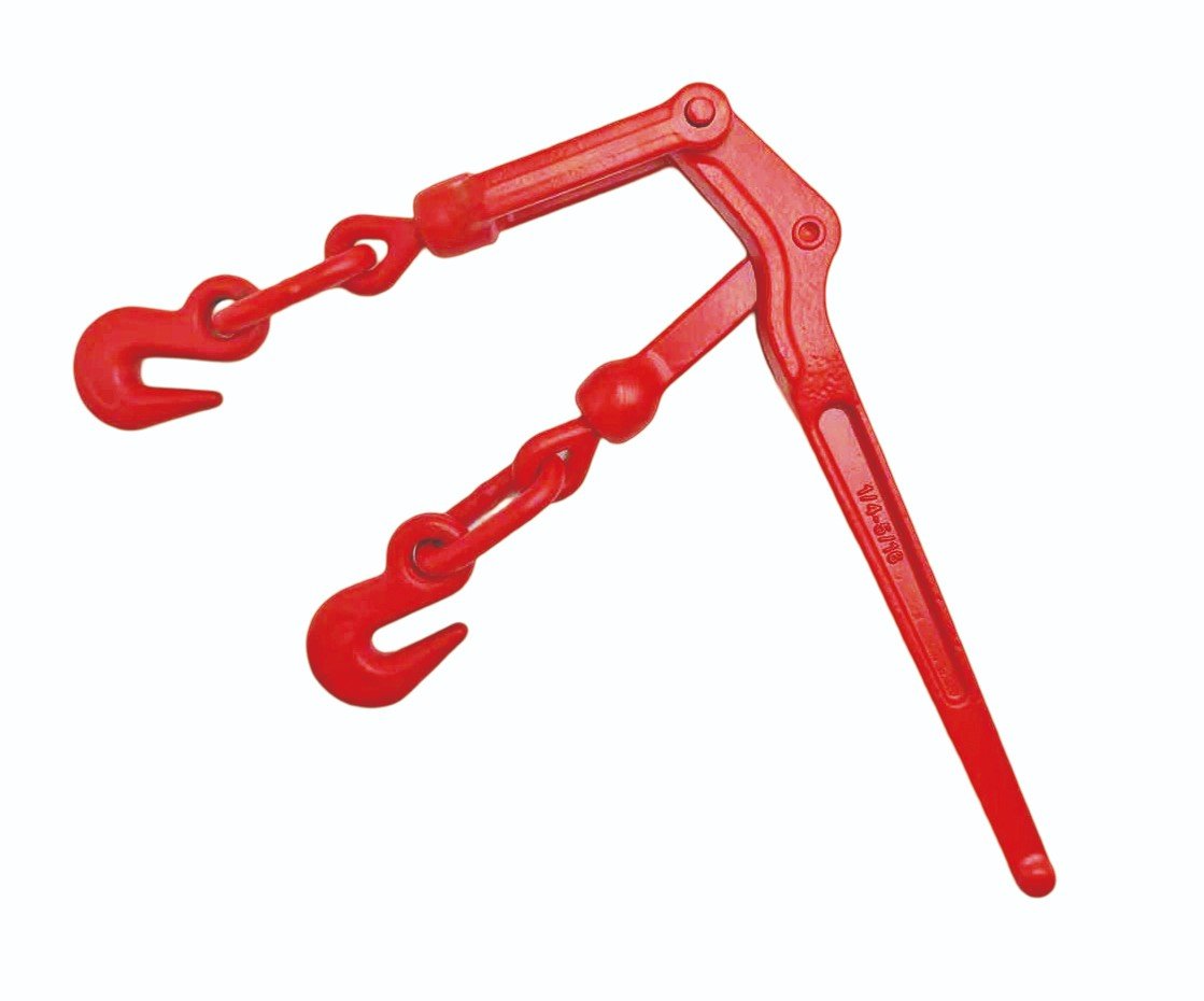 A lever-type load binder uses a long handle to create tension through a single, powerful levering motion. Once the chain is connected to both hooks, the operator pulls the lever down to tighten and lock the chain. The tension is applied quickly and directly, relying on mechanical leverage.
